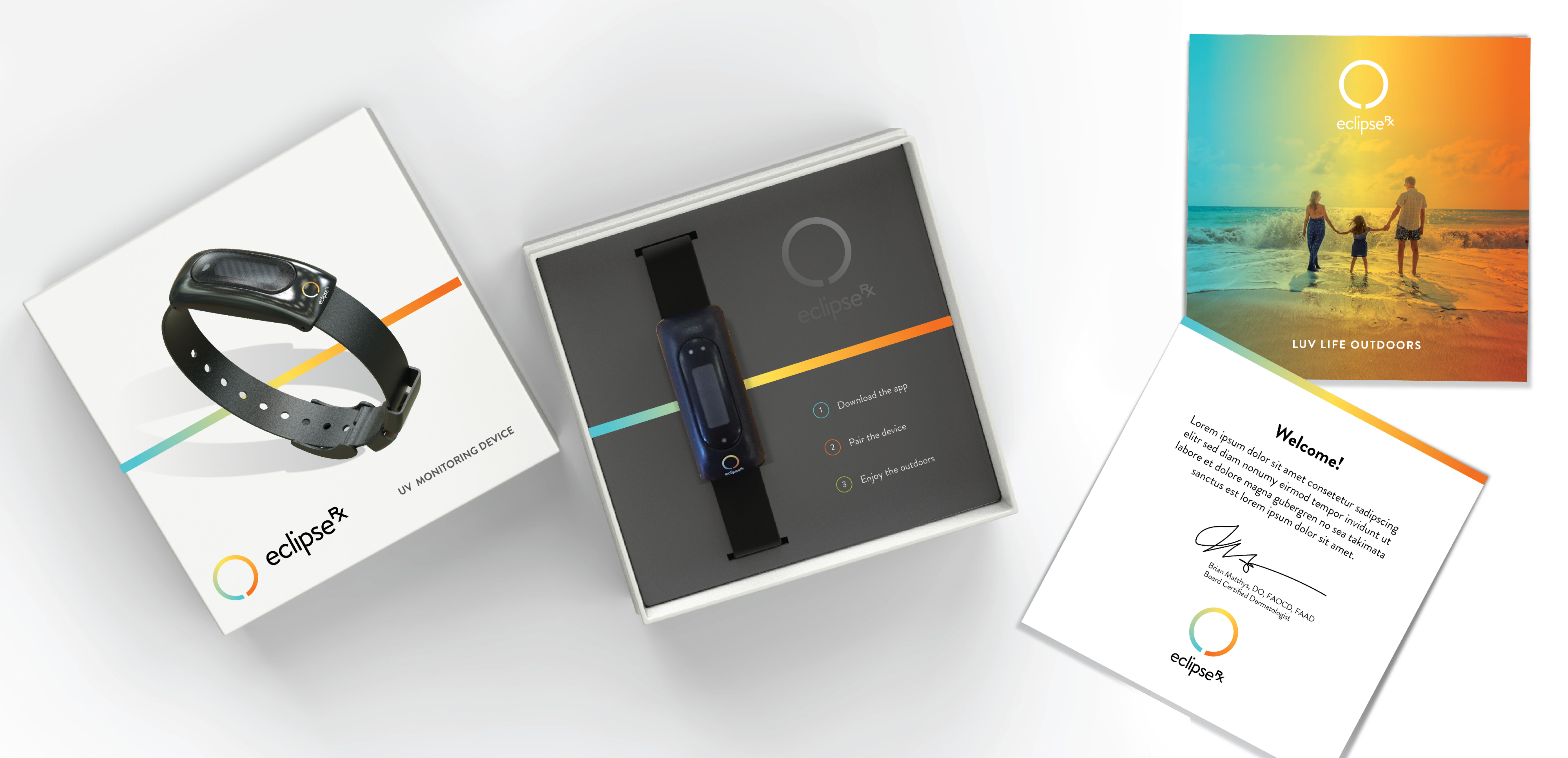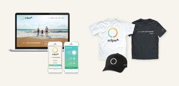 Entrepreneur and Certified Dermatologist Brian Matthys hired Haystack Studios to develop the brand identity and assets for his new product venture, Eclipse Rx, a wearable UV monitoring device + app designed to track UV index levels and provide alerts and tips on how to best protect yourself in current conditions. The Eclipse Rx brand works behind the scenes protecting each person with a custom profile, so the brand needed to feel advanced, approachable and smart. Below is where we landed. The gradated circular icon represents the progression of Eclipse's monitoring system throughout each day in a person's life. The precise geometry and hard angles speaks to the brand's technical expertise, while the lowercase rounded font feels human and approachable.